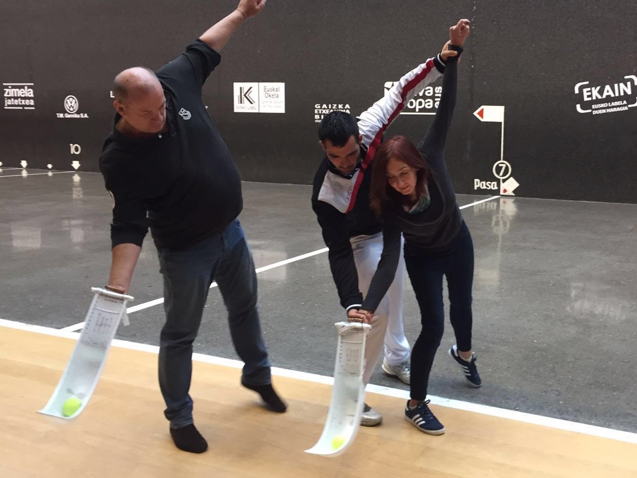 El grupo baja a cancha a probar a jugar a pelota de la mano de los pelotaris y monitores. Tras ver el espectáculo de pelota, todos quieren probar a jugar. Es como un baile, movimiento de caderas y brazos. Una experiencia apta para cualquier edad y condición. Sé pelotari por un día!